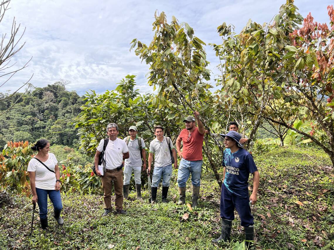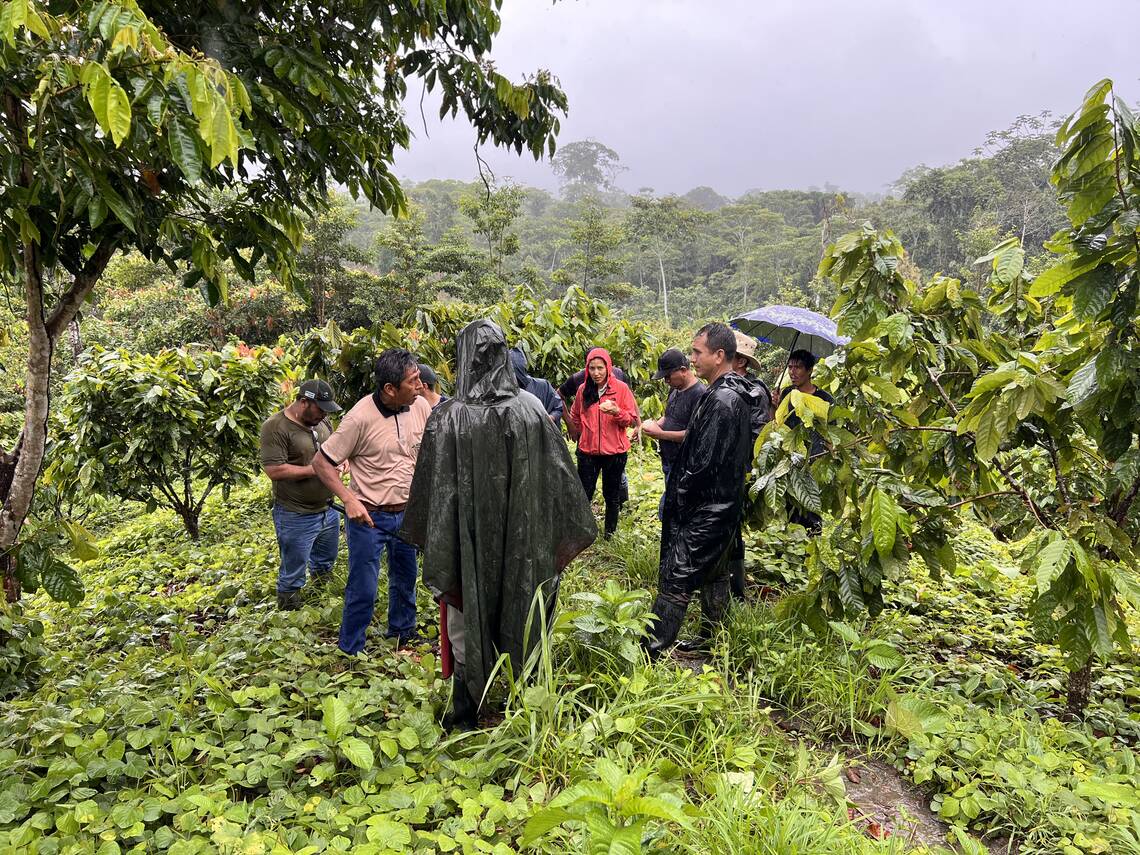 Besuch der Kakaofelder mit Fortunato Velásquez und dem technischen Team von Norandino – ein wertvoller Austausch von Wissen und Erfahrung.