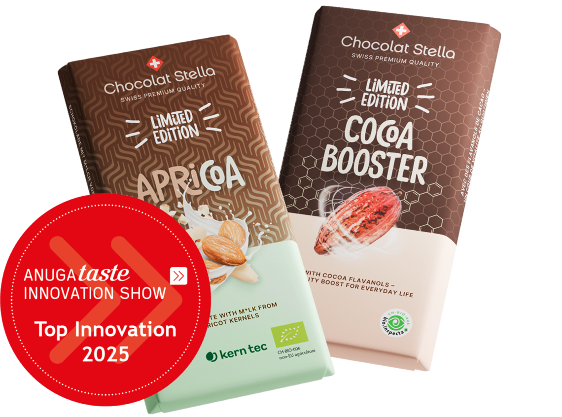 Im selben Jahr lanciert Stella zwei neue Limited Editions: «ApriCoa», eine vegane Schokolade mit Aprikosenkernen, und «Cocoa Booster», der natürliche Alltags-Booster mit Kakaoflavanolen.