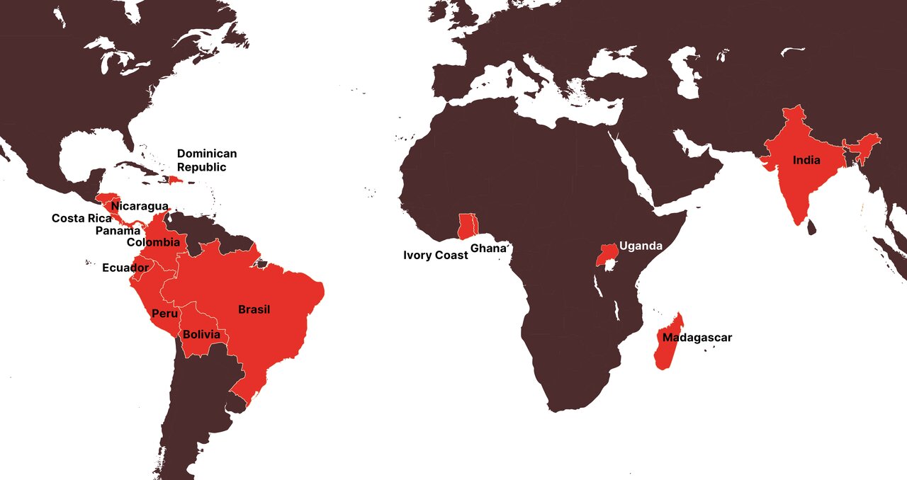 Acquistiamo il nostro cacao da tutte le principali aree di coltivazione del mondo, dalla Repubblica Dominicana al Sud America, dall’Africa all’Asia. In questa cartina è riportata una selezione delle nostre pluriennali collaborazioni con i produttori di cacao e i piccoli coltivatori.